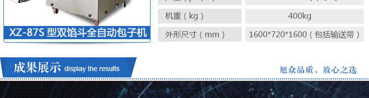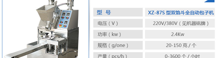 XZ-87S型双馅斗全自动好色先生污污,可生产各种肉包、肉菜包、菜包、小笼包、汤包、水晶包、圆馒头、奶黄包、豆沙包、叉烧包、南瓜饼等几十种包馅制品。适用于宾馆、饭店、学校、机关企业食堂、馒头或包子加工厂、早餐工程店及速冻食品厂等单位。可满足不同客户群体。免费提供工艺技术。免费上门培训指导安装。