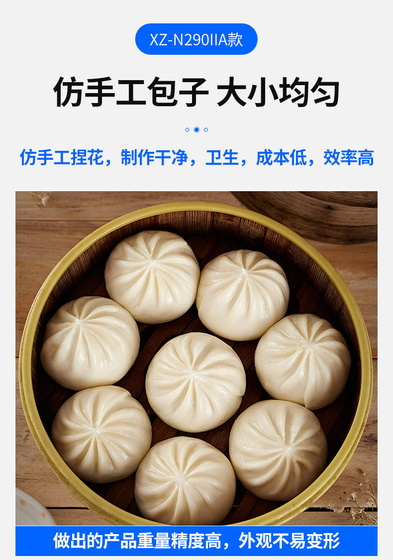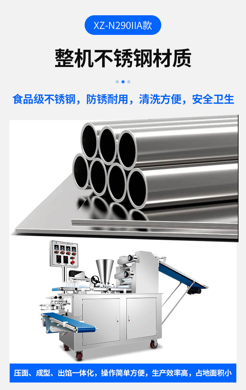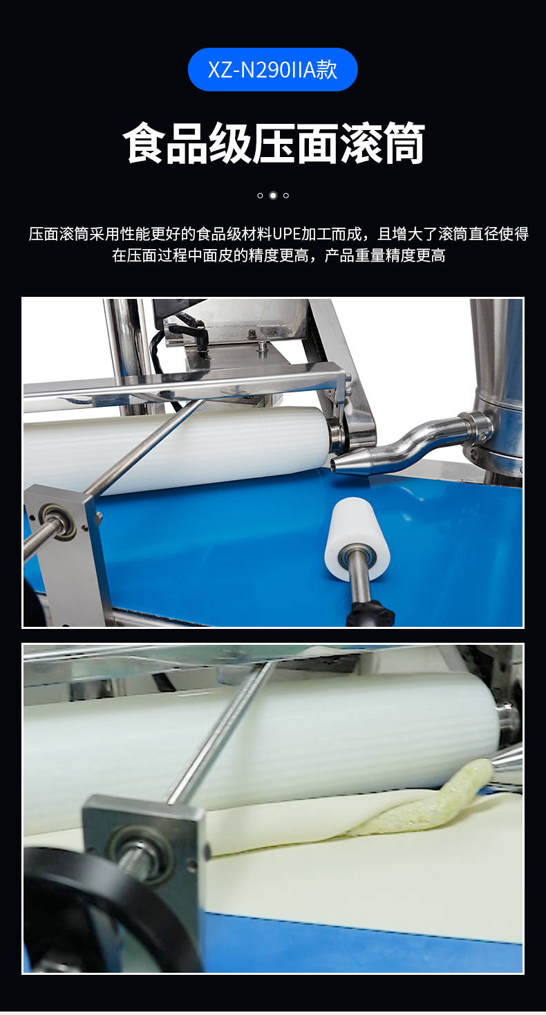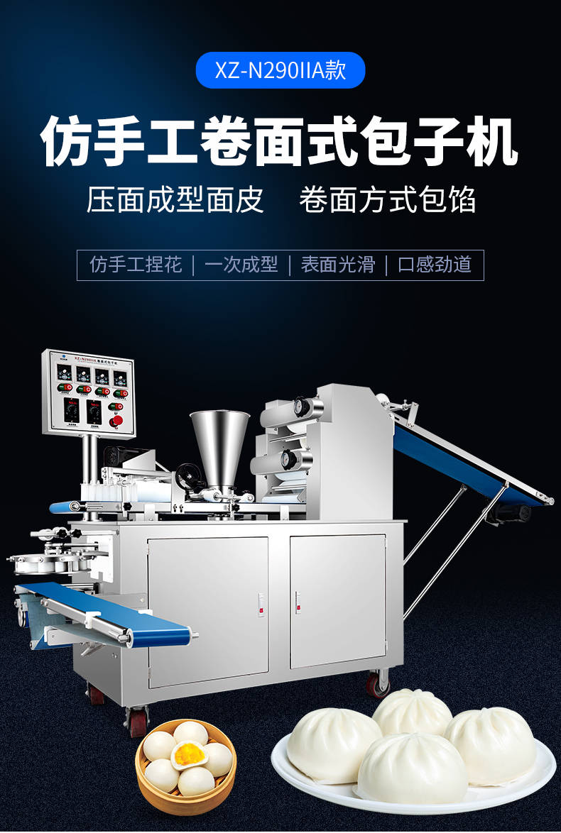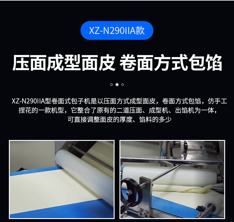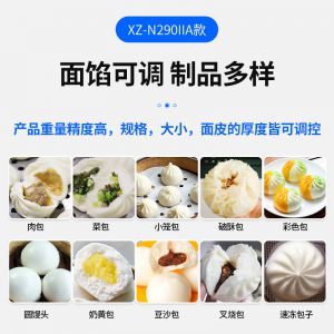 XZ-N290IIA卷面式好色先生污污,压面成型面皮,卷面方式包馅。仿手工捏花、一次成型、表面光滑、口感劲道。面馅可调、制品多样。产品重量精度高,规格,大小,面皮的厚度皆可调控。