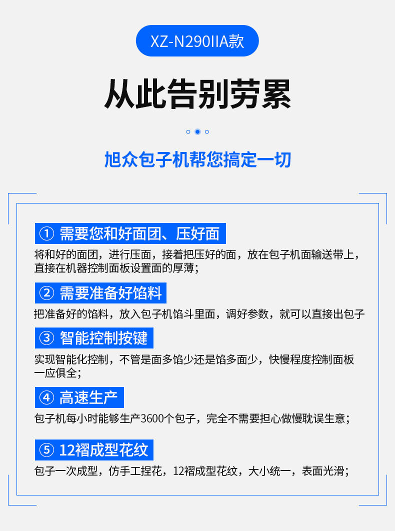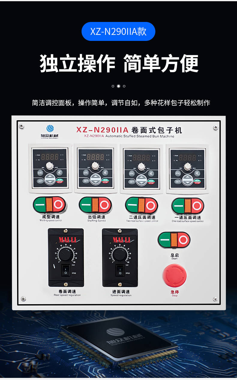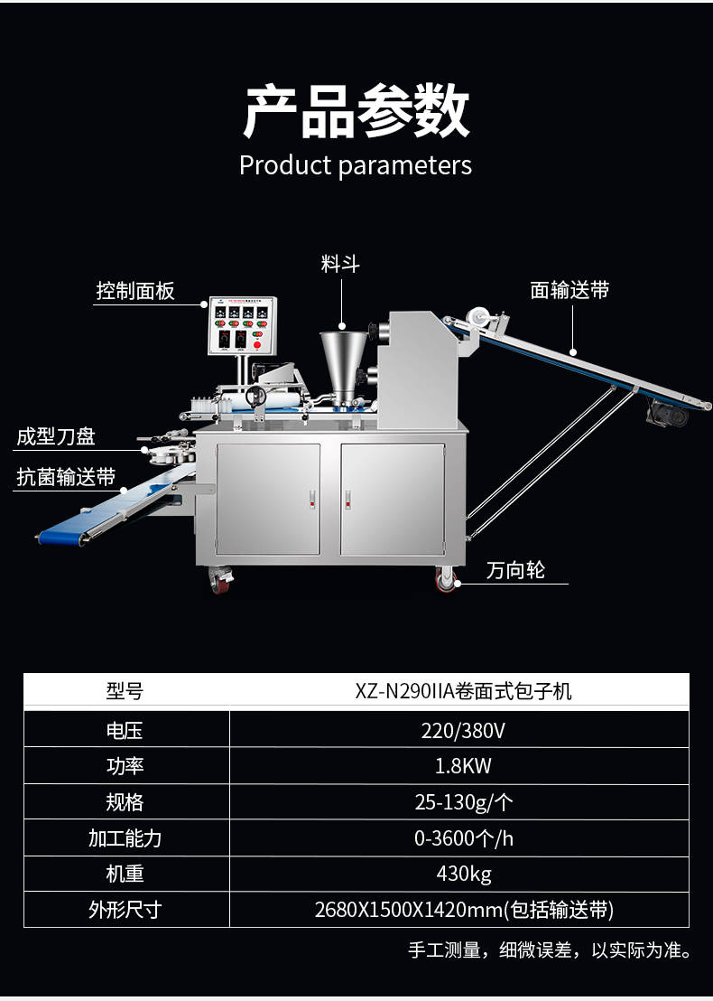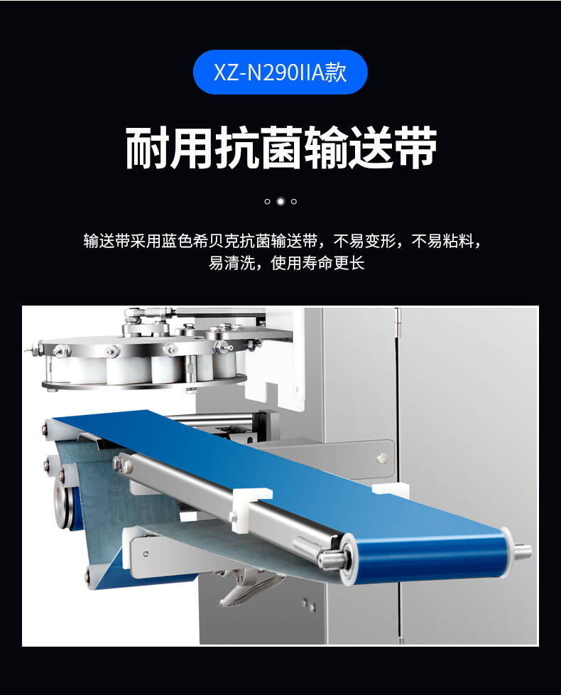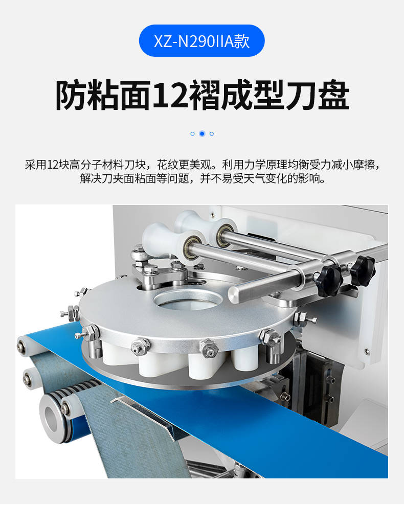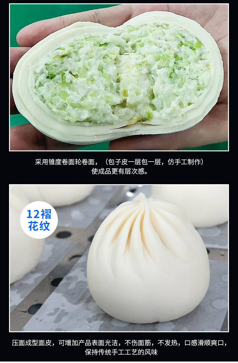 XZ-N290IIA卷面式好色先生污污,压面成型面皮,卷面方式包馅。仿手工捏花、一次成型、表面光滑、口感劲道。面馅可调、制品多样。产品重量精度高,规格,大小,面皮的厚度皆可调控。