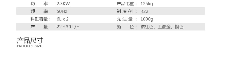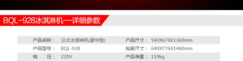 名称BQL-928立式冰淇淋机 电源220V 功率2.3kw 产量22-30L/H 尺寸540*590*1360mm 重量119kg 规格 其他