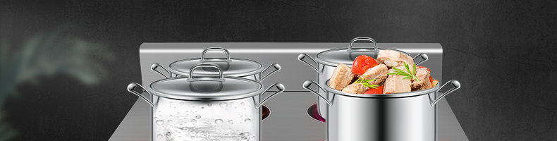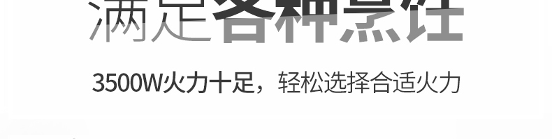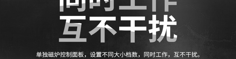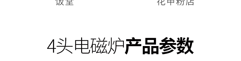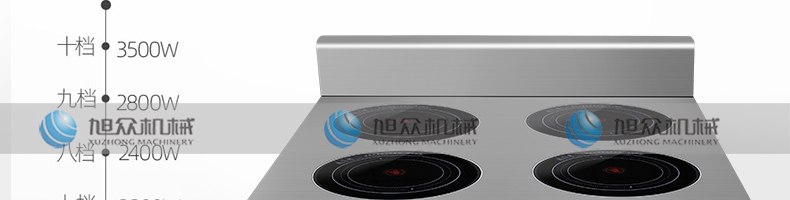 四头柜式电磁炉,10档调节,满足各种烹饪。3500W火力十足,轻松选择合适火力。同时工作互不干扰单独磁炉控制面板,设置不同大小档数,同时工作,互不干扰。