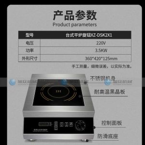 台式平炉旋钮XZ-DSK2X1,商用智能电磁炉3500W大火力、节能省电、聚能加热。您需要一台经久耐用的好电磁炉不锈钢材质加厚不锈钢架构,稳定耐用,不易生锈,耐腐蚀,易清洁,干净省事。