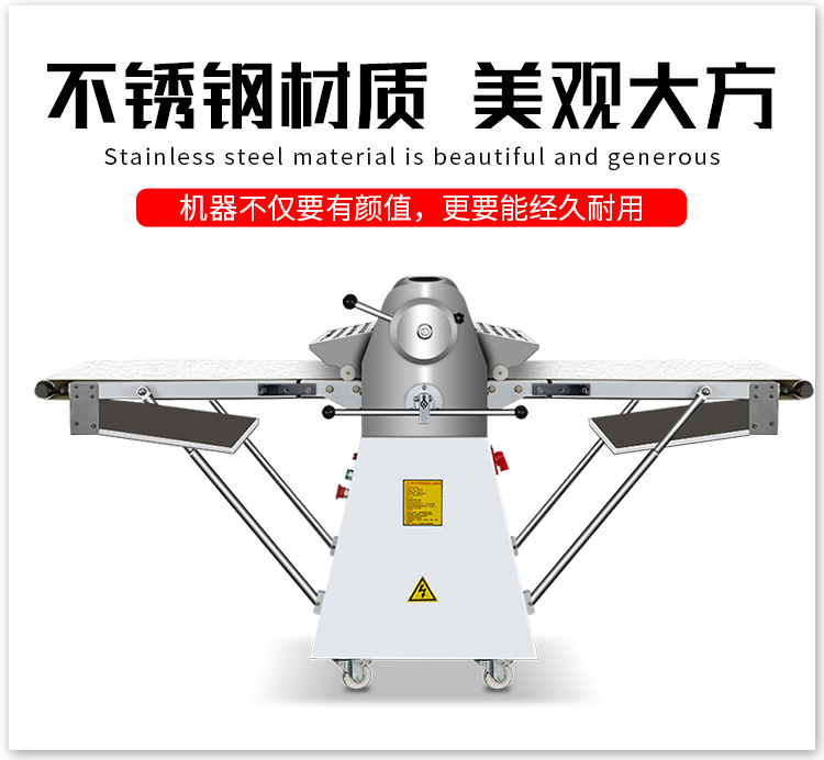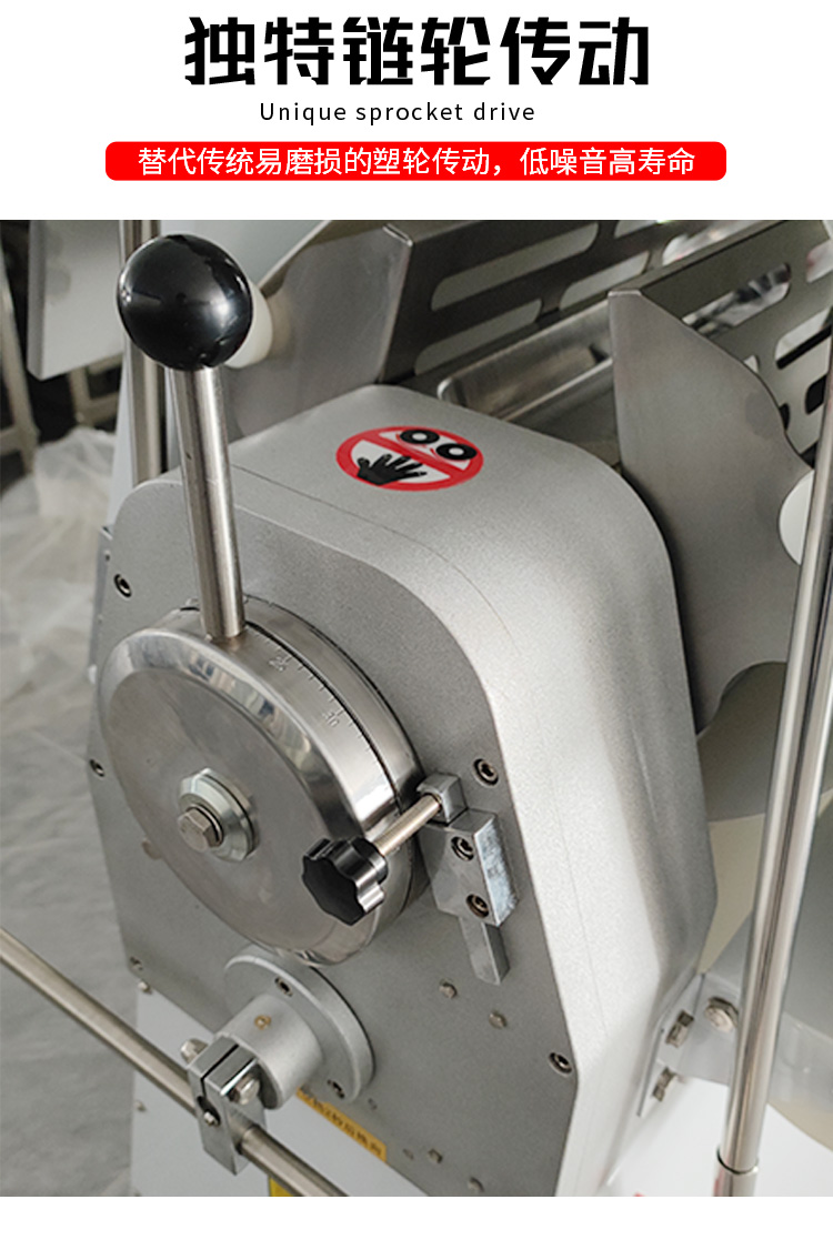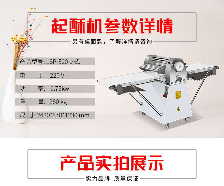 LSP-520酥皮机,采用独特的链轮传动替代了传统易磨损的塑轮传动,低噪音,高寿命滚轮经过特殊工艺处理,不粘面,不易刮伤适用于手撕面包、羊角面包、蛋挞、老婆饼、千层饼,等酥皮类食品,也可用于辗压面团。