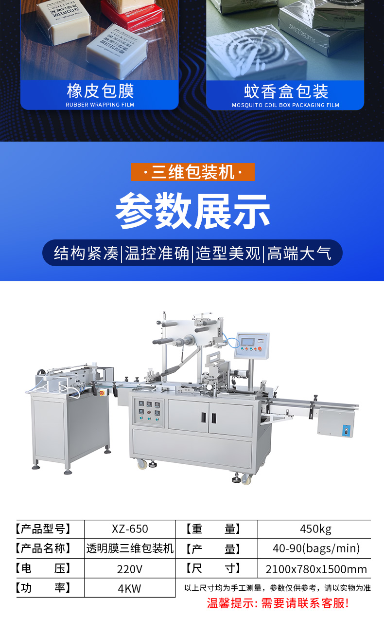 XZ-650包装机,三维包装机,全自动化操作出膜、切膜、包膜、热封一次完成。可广泛应用多种产品,适用包装的产品有食品、扑克牌、香烟盒化妆品、日用品、文具用品等类型产品。