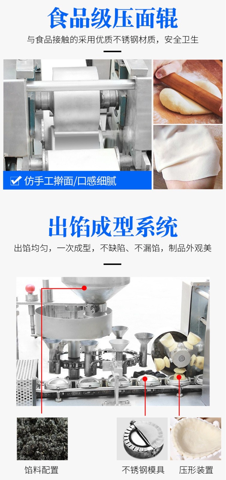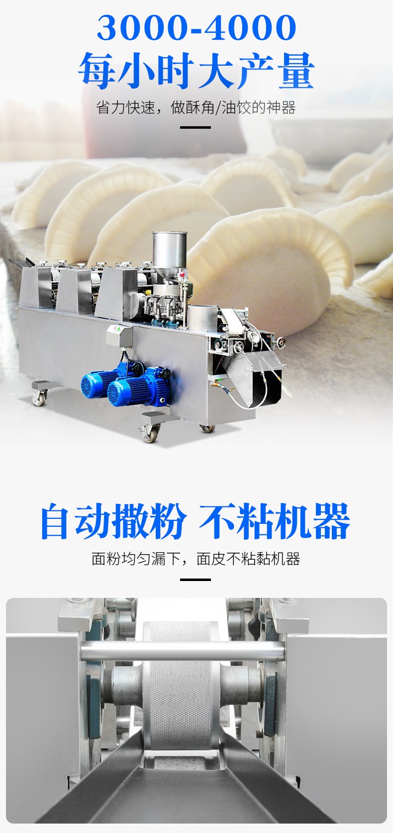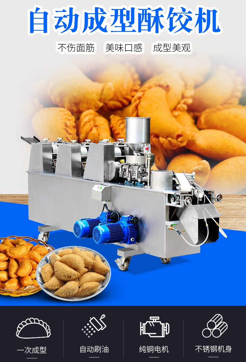 自动成型油饺机,创业商用、省时省力。适用于制作酥角、油饺。3000-4000每小时大产量。省力快速,做酥角、油饺的神器。自动撒粉 不粘机器。面粉均匀漏下,面皮不粘黏机器。
