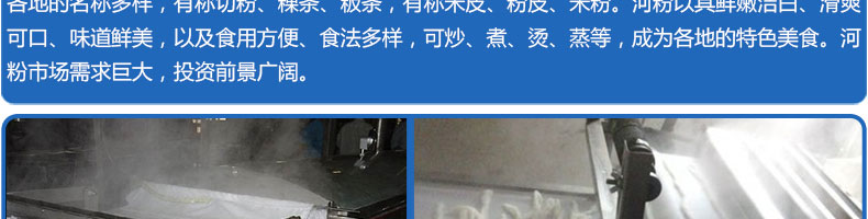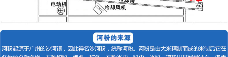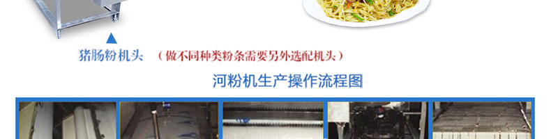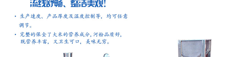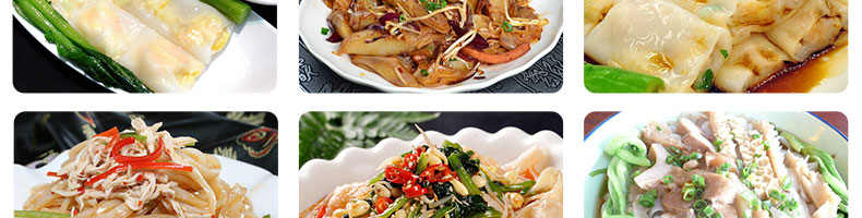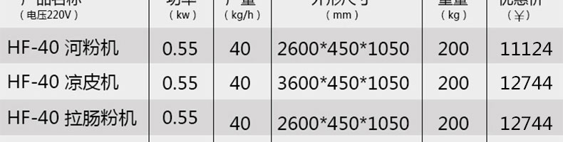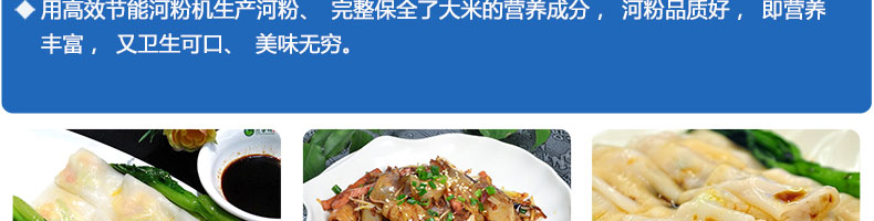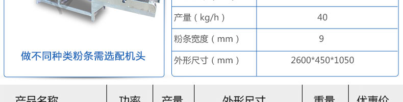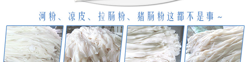 名称SZ-HF-40高效节能河粉机 电源220/380V 功率0.75/19kw 产量16/24/32/40kg/h 尺寸主机尺寸2600*450*1050mm 外形尺寸2700*650*1500mm 重量200kg 规格粉条宽度mm:4/6/8/10 其他