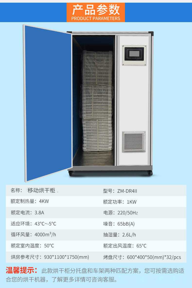名称烘干抽湿一体机(带烘房) 电源220/50Hz 功率1KW 产量循环风量:4000m3/h、抽湿量:2.6L/h 尺寸烘房参考:930*11001750(mm)、烤盘:600*400*50(mm)*32/pcs 重量联系销售员 规格额定室内温度:50°C、额定出风温度:65°C 其他适应环境:43°C~5°C、噪音:65bB(A)
