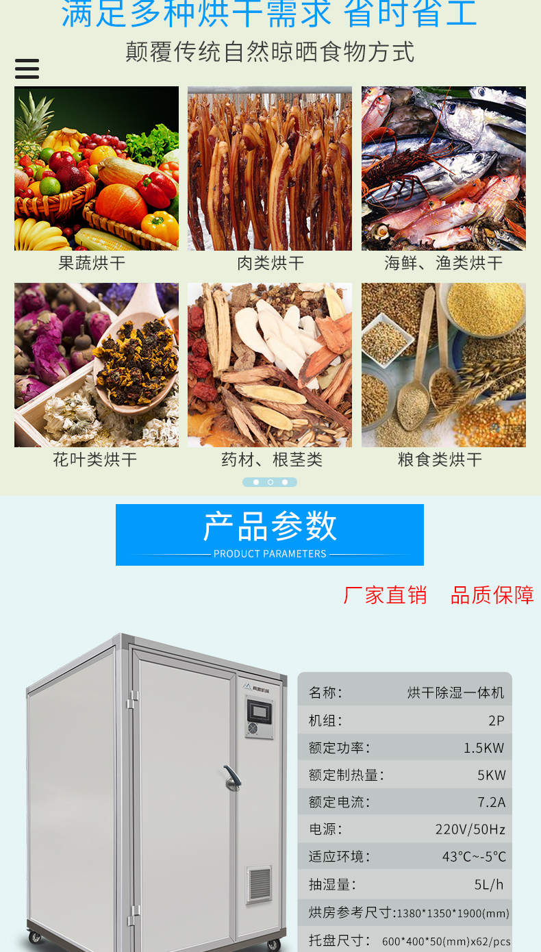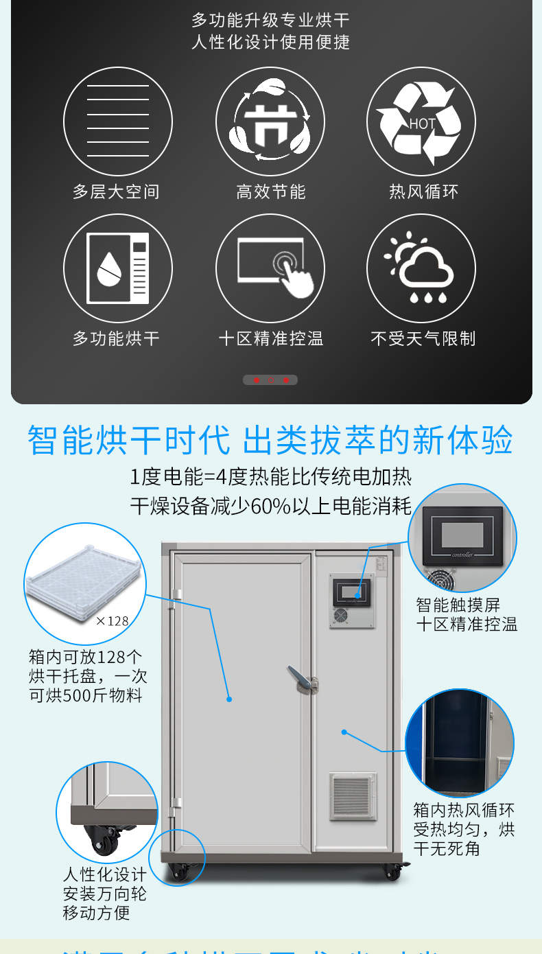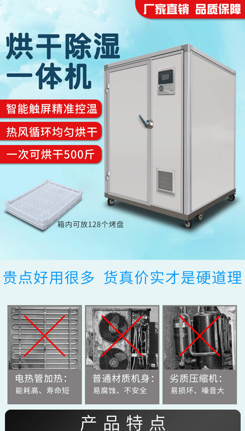 烘干除湿一体机,烘干除湿体机,智能触屏精准控温热风循环均匀烘干次可烘干500斤,智能烘干时代出类拔萃的新体验,1度电能=4度,热能比传统电加热。干燥设备减少60%以上电能消耗。