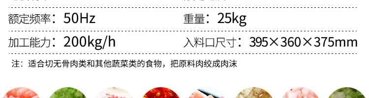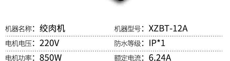 名称XZBT-12A绞肉机 电源220V 功率850W 产量 尺寸395×360×375mm 重量25kg 规格 其他
