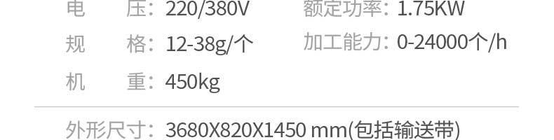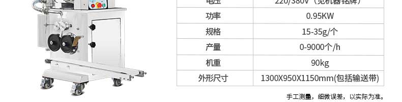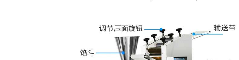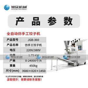 名称JGB-360仿手工饺子机 电源220/380v 功率1.75kw 产量0-24000个/h 尺寸3680*820*1450mm 重量450kg 规格12-38g/个 其他