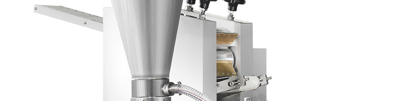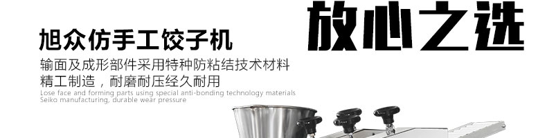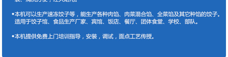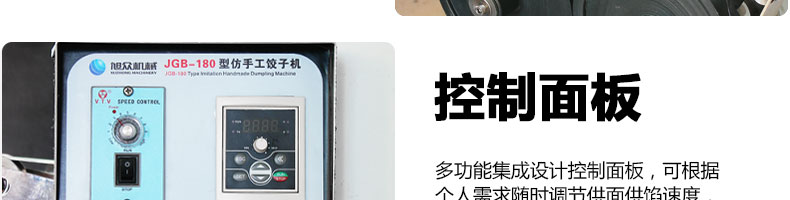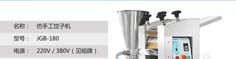 JGB-180饺子机,先进的自动饺子生产设备,包括主动压皮部分、自动供馅部分、自动包合部分、自动成品输送部分,并且只要更换模具,就可制锅贴等食品。适合食品速冻厂、饭店、厂矿学校食堂等制作包馅面制品单位使用。