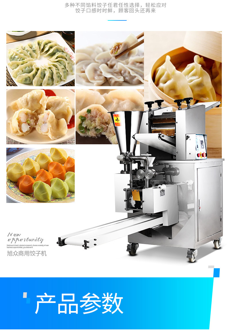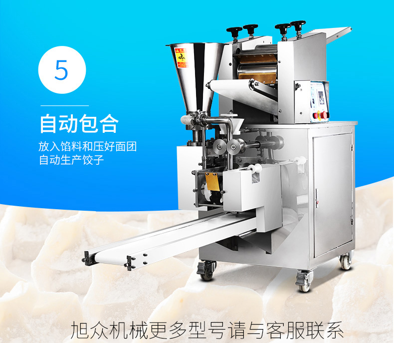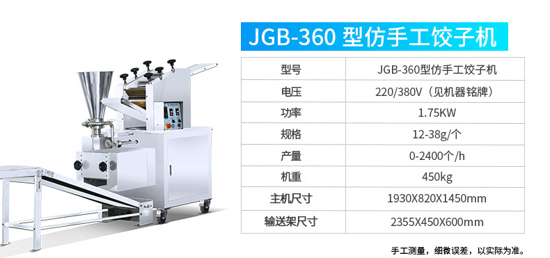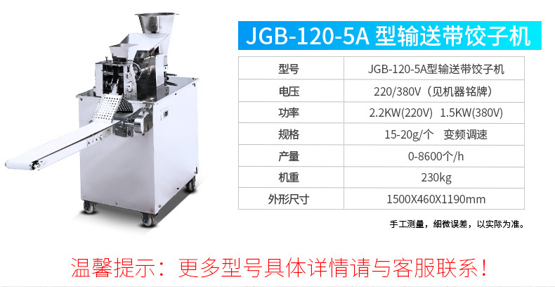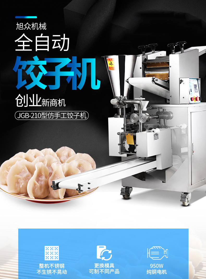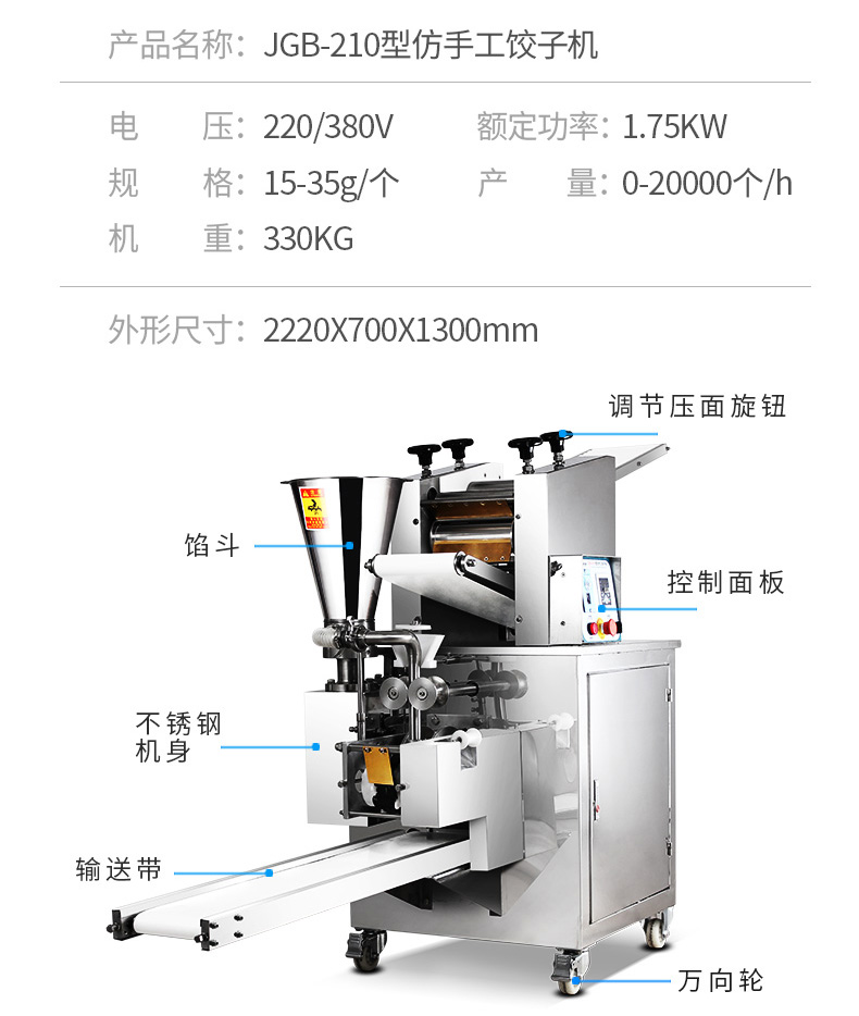 JGB-210型仿手工饺子机,本机采用自动压面皮包饺子的新工艺技术,本机可生产速冻饺子等,能生产各种肉馅、肉菜混合馅、全菜馅及其他种馅的饺子,适用于饺子馆、食品生产厂家、宾馆、饭店、餐厅、团体食堂、学校、部队。免费上门安装调试,赠送面点工艺