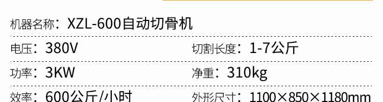 名称XZL-600切骨机 电源380V 功率3kw 产量600公斤/小时 尺寸1100*850*1180MM 重量310kg 规格 其他