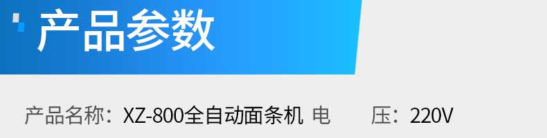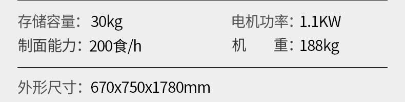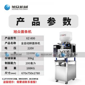 名称XZ-800全自动鲜面条机 电源220V 功率电机功率:11KW 产量制面能力:200食/h 尺寸670X750X1780mm 重量188kg 规格联系销售员 其他存储容量:30kg