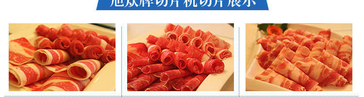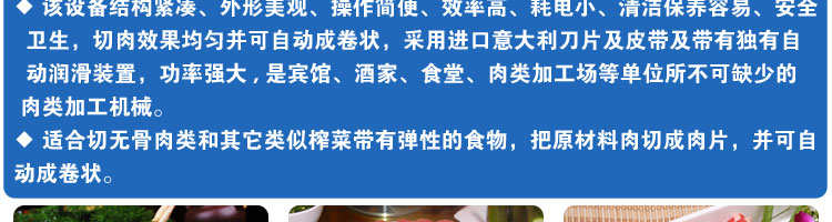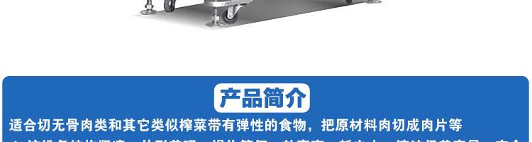 SA-350H 全自动落地式切片机,适合切无骨肉类和其他类似榨菜带有弹性的食物,把原材料肉切成肉片,并可自动成卷状。可切牛肉片、羊肉片等