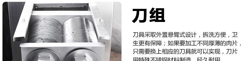 XZ-QE切肉机,是一款可方便移动的肉类加工设备,配置单层刀具一次性切肉片,二次切肉丝,再切成粒。底座设置有滑轮,移动灵活,轻松便捷;刀具采取外置悬臂式设计,拆洗方便,卫生更有保障;配置多种刀具,可加工不同厚度的肉片,实现一机多用;机内装有安全保护开头,刀具外露时,机器自锁不能启动,以保安全;刀片用特殊不锈钢材料制造,经久耐用;卸下的刀具,不用清洗直接放置在6摄氏度以下的冰箱里,刀具余肉不发臭。