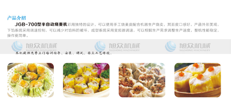 JGB-700烧麦机,采用特的设计,可以使用手工烧麦皮配合机器生产烧卖,其面皮口感好,产品外形美观下馅系统采用调速控制,可以减少对馅料的破坏,成型系统呆用变频器调速,可以根据生产需求调整生产速度,整机性能稳定操作更简单