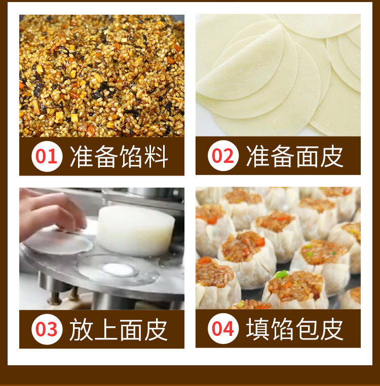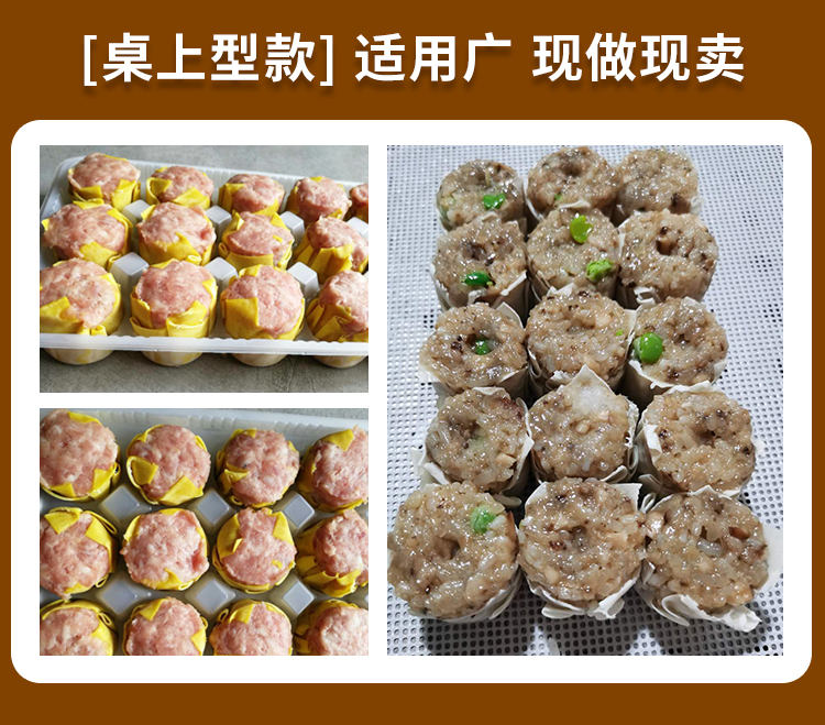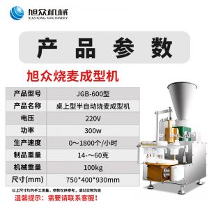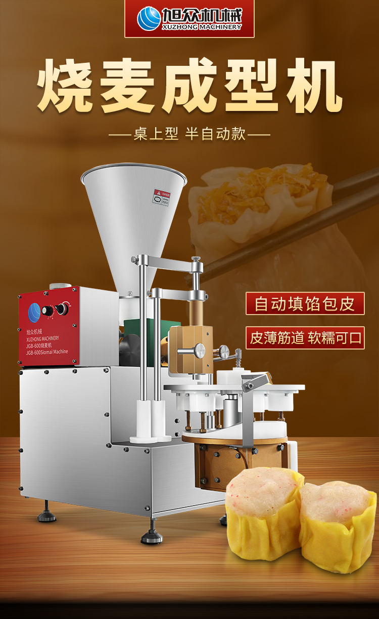 JGB-600烧麦机,自动填馅包皮功能:台式半自动单联式烧麦成型机,可以使用手工烧麦皮配合机器生产烧卖,其面皮口感好,产品外形美观。馅料多与少可调节高效率1800个小时