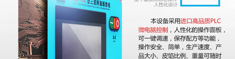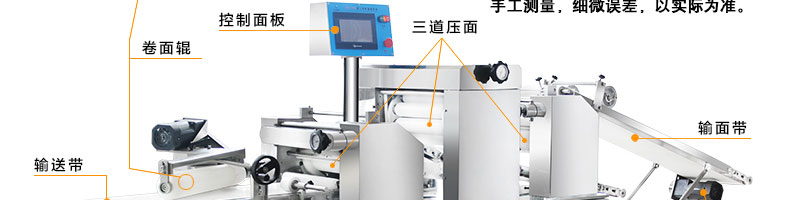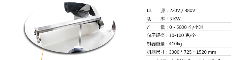 名称xz-15c三道擀面酥饼机 电源220/380V(见机器名牌) 功率3kw 产量0-5000个/小时 尺寸主机尺寸3300*725*1520mm,成型机尺寸1550*800*820mm,出馅机尺寸870*4 重量410+110+170kg 规格10-150克/个 其他