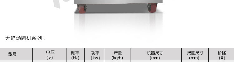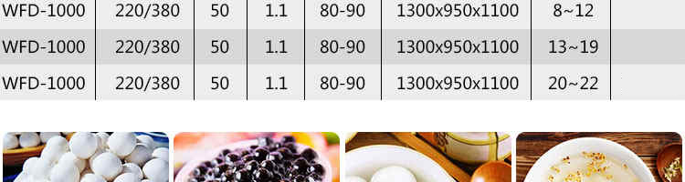 名称VFD-1000无馅汤圆机 电源220/380V(见机器名牌) 功率1.1kw 产量20-50kg/h(规格不同,产量不同) 尺寸外形尺寸1300*950*1100mm 重量 规格8-34mm 其他
