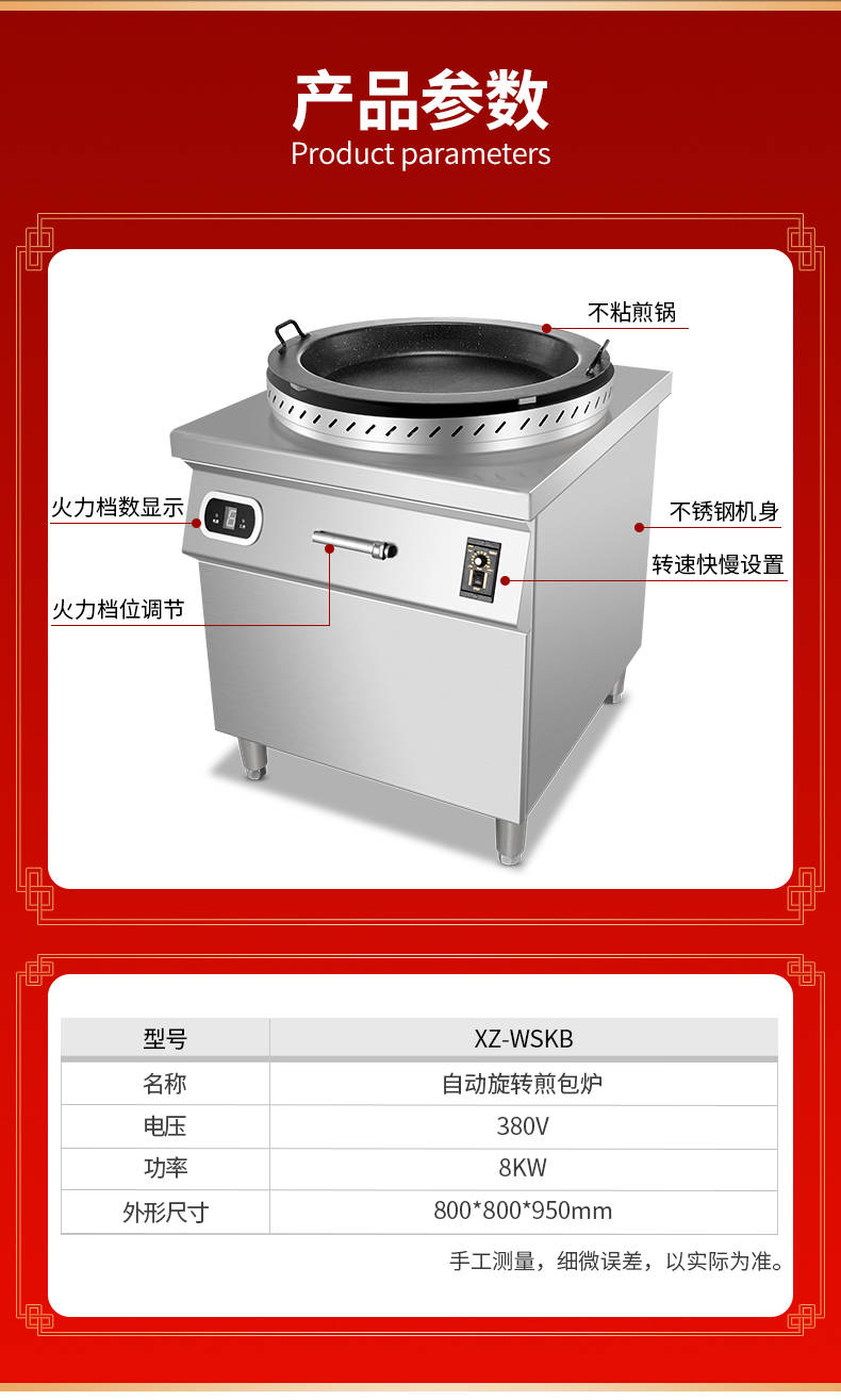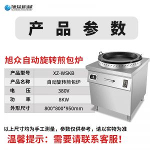 名称XZ-WSKB自动旋转煎包炉 电源380V 功率8KW 产量请咨询销售员 尺寸800*800*950mm 重量请咨询销售员 规格请咨询销售员 其他