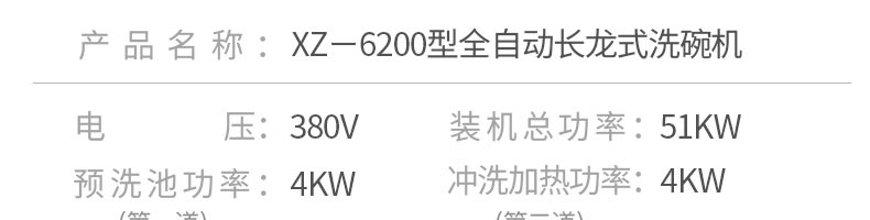 名称XZ-6200长龙式洗碗机 电源380v 功率51kw 产量 尺寸6200*850*1630mm可订制 重量 规格 其他