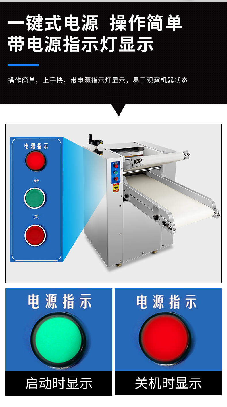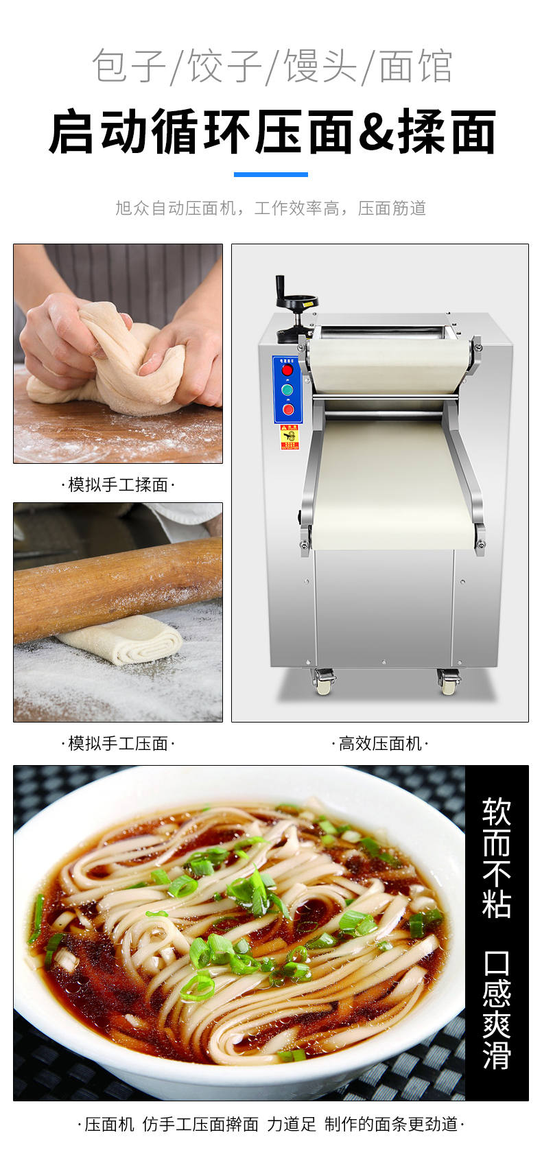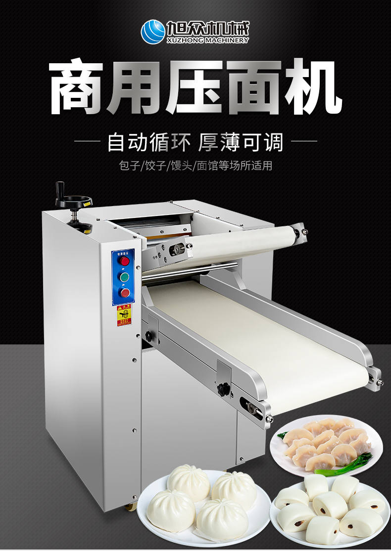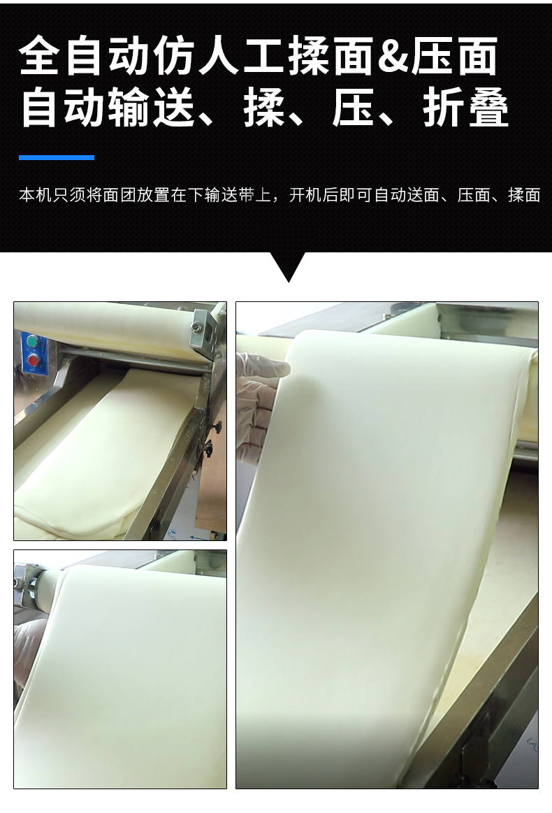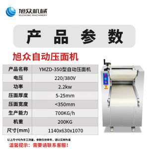 YMZD-350自动压面机,自动循环、厚薄可调。包子、饺子、馒头,面馆等场所适用。启动循环压面、揉面。全自动仿人工揉面,压面自动输送、揉、压、折叠。