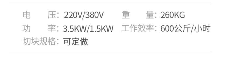 名称禽类剁块机 电源220v/380v 功率3.5kw/1.5kw 产量600公斤/小时 尺寸1300*700*850mm 重量260kg 规格可定做 其他