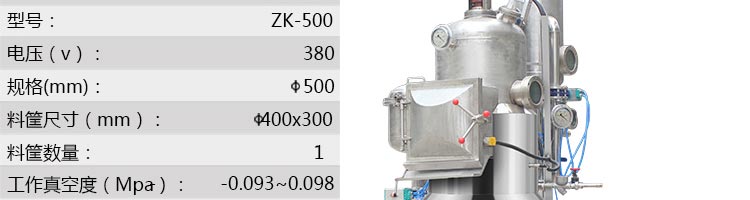 名称zk-500真空油炸机 电源380V 功率5.5+2.2kw 产量5-15kg/次 尺寸1400*1400*2500mm 重量 规格料框数量1组;加热方式:电/导热油 其他